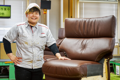 私はソファの最終工程にあたる「張り」を担当しています。この工程ではソファのフレームにウレタンと革や布を張り込みます。革には様々な種類があり、中には鉄板のように硬い革もあり、それを張り上げる作業はまるで幼少期に習っていた格闘技のようです。扱いが難しい革を美しく張り上げ、お客様に喜んでいただけたときは、大きな喜びと誇りを感じます。